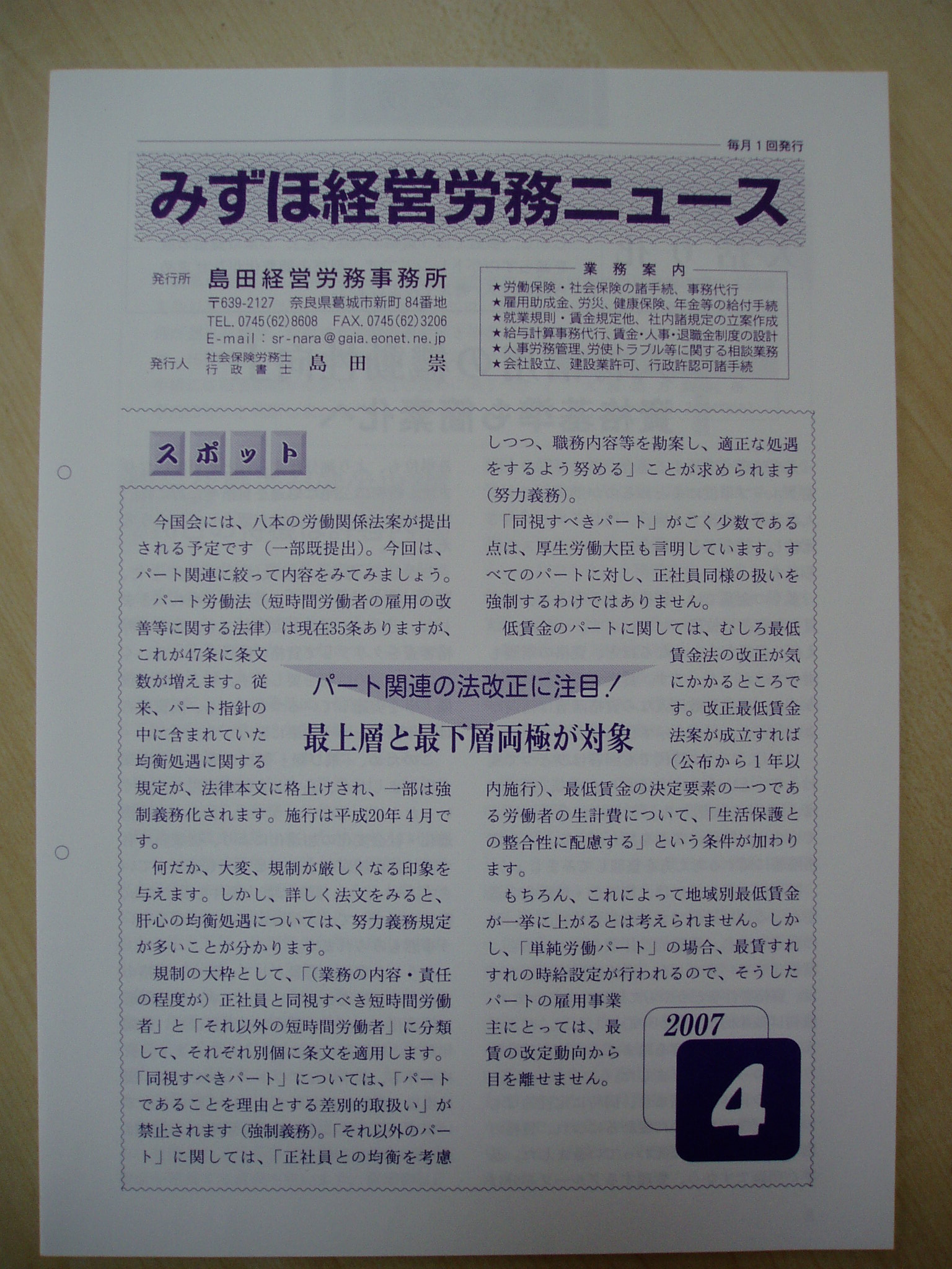 当事務所では、顧問契約先の事業所さんへ事務所ニュース「みずほ経営労務ニュース」を配布しています。未契約の事業所さんも3ヶ月間無料で送付しますのでご連絡ください。